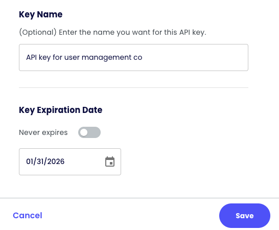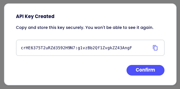 After a key is created, the page will display your new API key. Save it immediately in a secure location such as: